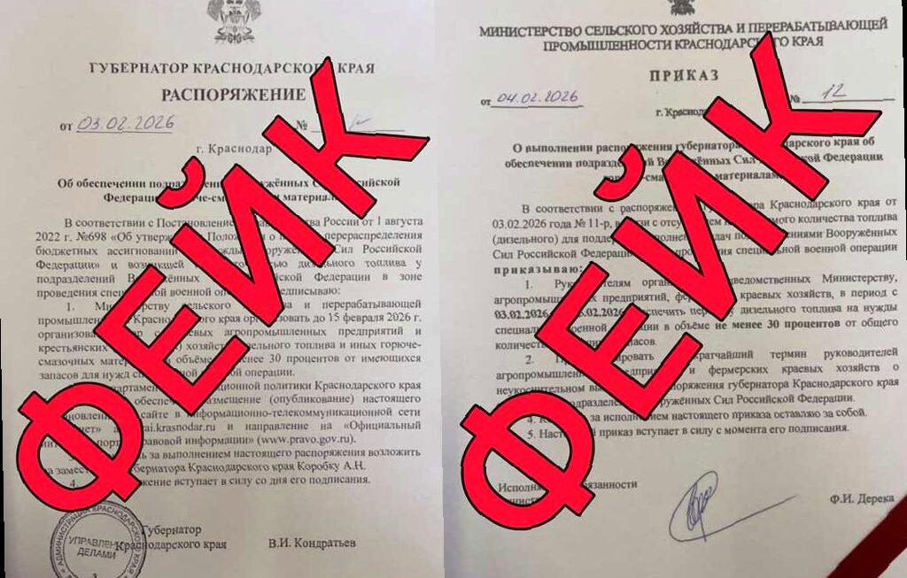 По данным штаба, в интернете появились документы, которые якобы подписаны губернатором Вениамином Кондратьевым и и.о. министра сельского хозяйства и перерабатывающей промышленности Федором Дерекой. В них утверждается, что аграрии региона должны передать часть топлива на нужды Вооруженных Сил России.